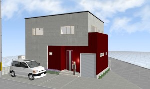 コンクリート打ちっ放しのサイディングに、赤いサイディングがすっごい映える家になりそうだ!