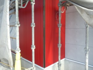 現場では、ついに真っ赤な金属サイディングが貼られ始めました。